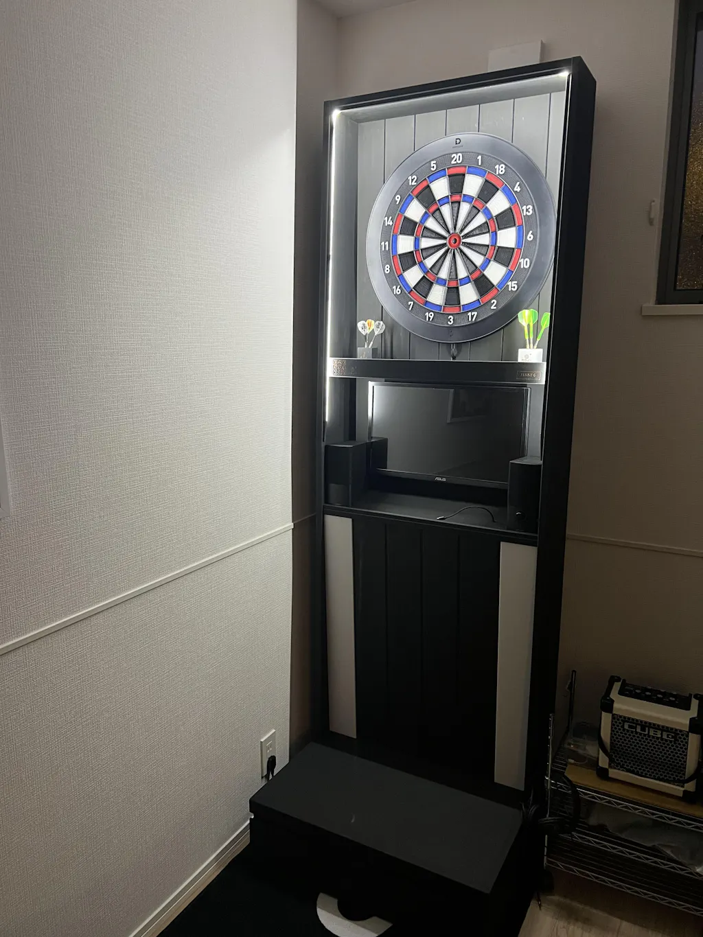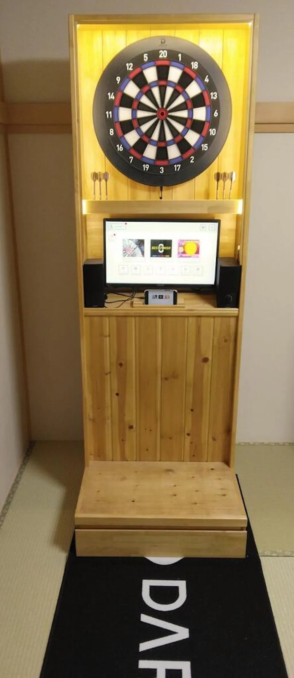 ダーツにハマり、練習とお家時間を充実させる目的で購入。賃貸で、天井が高くないので、ダーツ台の中にモニターが収まるフェネックを選びました。お店で見るマシーンと違って、部屋に馴染みやすく、おしゃれ!